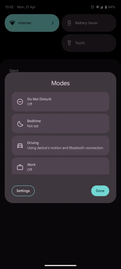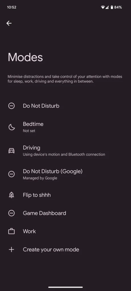 بالإضافة إلى قائمة الوصول السريع، سترى أيضًا إعداد الأنماط (Modes) مخصصًا في قائمة الإعدادات (Settings) بهاتف Pixel.