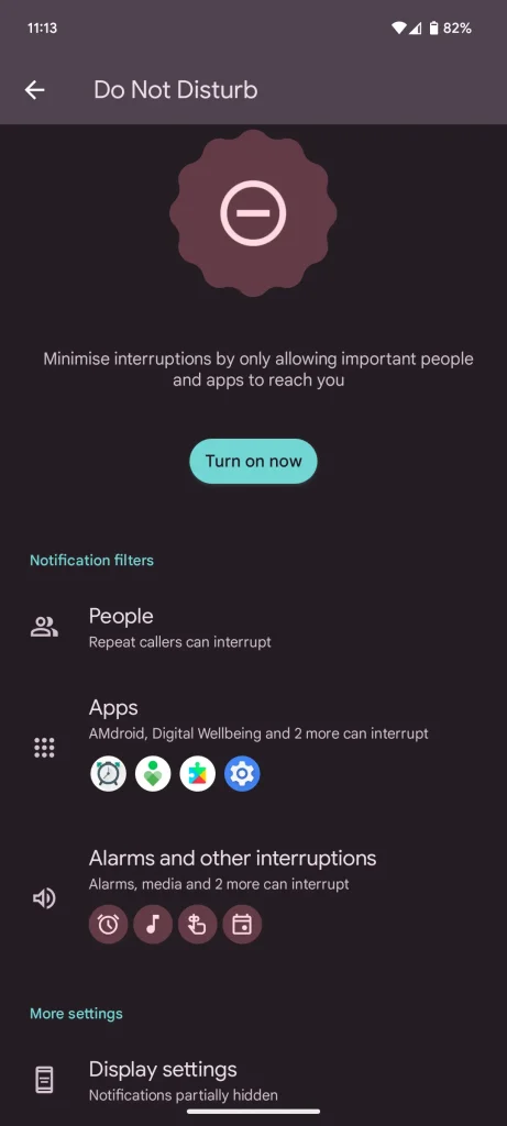 يوفر كل نمط العديد من الإعدادات، بما في ذلك إضافة جهات الاتصال والتطبيقات والإشعارات المحددة التي يمكن أن تصلك عندما يكون نمط معين نشطًا. يمكنك أيضًا الحصول على العديد من إعدادات العرض، مثل الإشعارات المخفية جزئيًا، وتغيير ألوان العرض إلى تدرج الرمادي، وتعطيل شاشة Always-On Display، وتعتيم الخلفية، وتمكين الوضع الداكن أثناء تمكين النمط.
