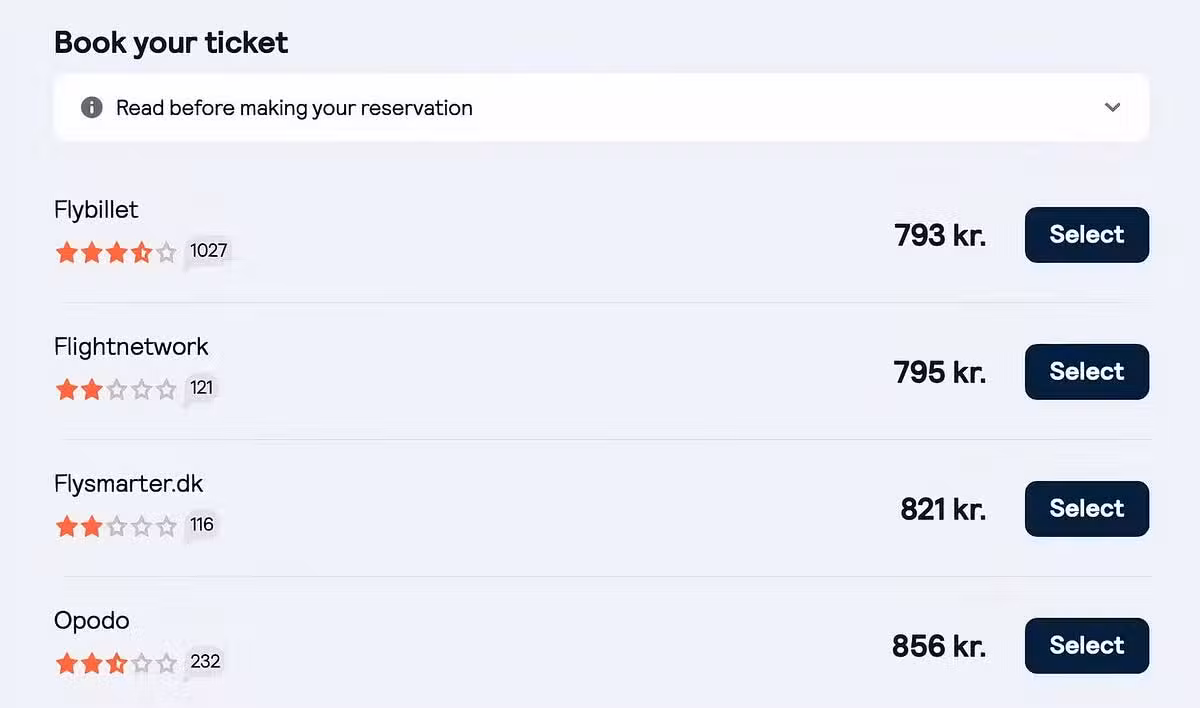 تُعد مواقع مقارنة الرحلات الجوية مواقع تجميعية؛ فعندما تجد رحلة تُريد حجزها، سيتم إعادة توجيهك إلى موقع ويب خارجي. سترى عادةً مواقع شركات الطيران مُدرجة، ولكنها عادةً ما تكون من بين العديد من مُقدمي خدمات الحجوزات من جهات خارجية. يُمكنك اختيار أي موقع ويب تُريد الحجز من خلاله، كما ترى في هذا المثال الذي اتخذته أثناء البحث عن رحلة على Skyscanner.