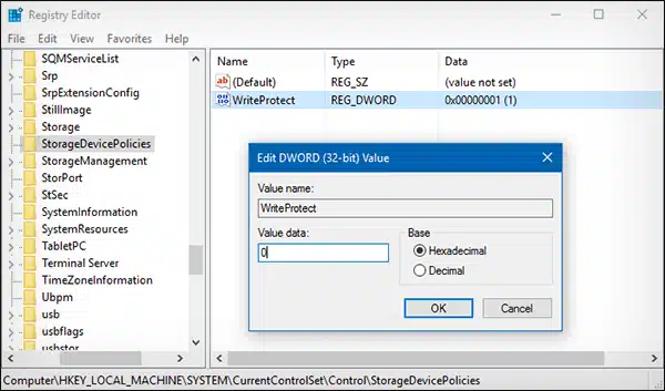 وبعد الوصول إلي ملف StorageDevicePolicies ستقوم من خلال الجهة اليمني بالنقر مرتين فوق مفتاح WriteProtect حيث نقوم بتعديل قيمته إلي 0 بدلاً من 1 ثم اضغط OK. وبعد ذلك قم بنزع الفلاشة ثم إعادة تركيبها لتجد انه تم حل المشكلة.