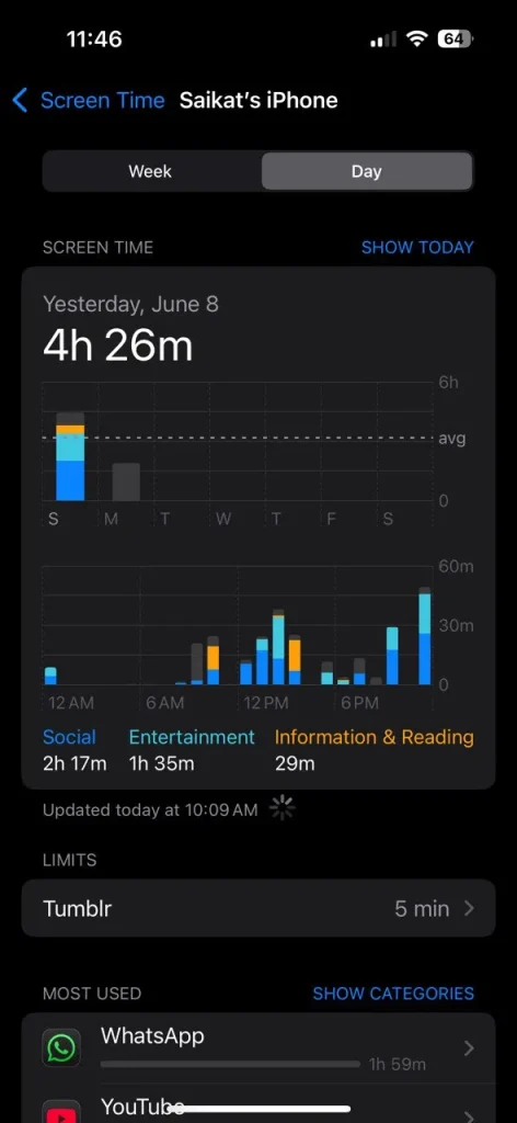 الخطوة الأولى كانت الأصعب: تحليل بيانات وقت الشاشة بصدق وموضوعية، دون جلد الذات. فتحت تطبيق Screen Time على جهاز iPhone الخاص بي، وكنت أتوقع الشعور بالخجل. ولكن بدلاً من ذلك، تعاملت مع الأمر على أنه تقرير أداء لعاداتي الرقمية.