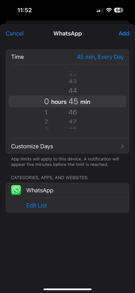 - خصّص حدود استخدام التطبيقات. تلعب التطبيقات المختلفة أدوارًا مختلفة في حياتك. قد تحتاج إلى وضع قيود صارمة على وسائل التواصل الاجتماعي، ولكن قيودًا أقل صرامة على تطبيقات المراسلة أو تطبيقات العمل. قم بتخصيص الحدود بما يتناسب مع احتياجاتك وأهدافك.