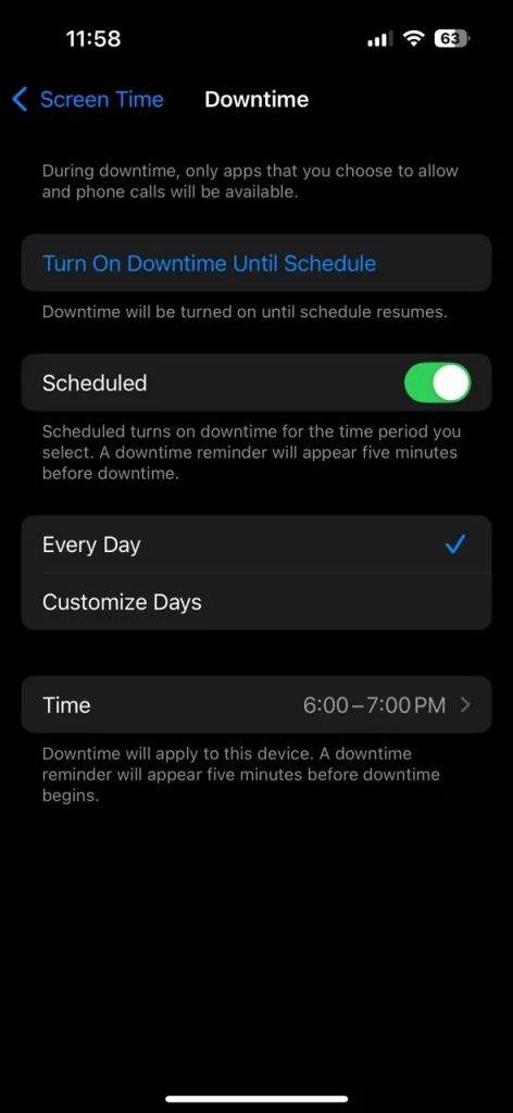 كن أكثر تعمداً بشأن الجدولة مع ميزة Downtime. انتقل إلى Settings > Screen Time. ثم، انقر فوق Downtime أسفل Limit Usage. قم بتبديل Scheduled، ثم خصص وقت التوقف عن التشغيل باستخدام Customize Days و Time.
