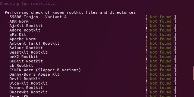 تطبيق الفحص التالي الذي قد ترغب في تثبيته هو Chkrootkit. فهو يقوم بفحص نوع من البرامج الضارة المحددة لأنظمة Unix مثل Linux و MacOS – rootkit. كما يوحي اسمه، فالهدف منه هو البحث عن ملفات rootkit المستخدمة لمساعدة المهاجمين للحفاظ على الوصول إلى النظام مع تجنب الكشف من طرف المستخدم أو أدوات المستخدم.
