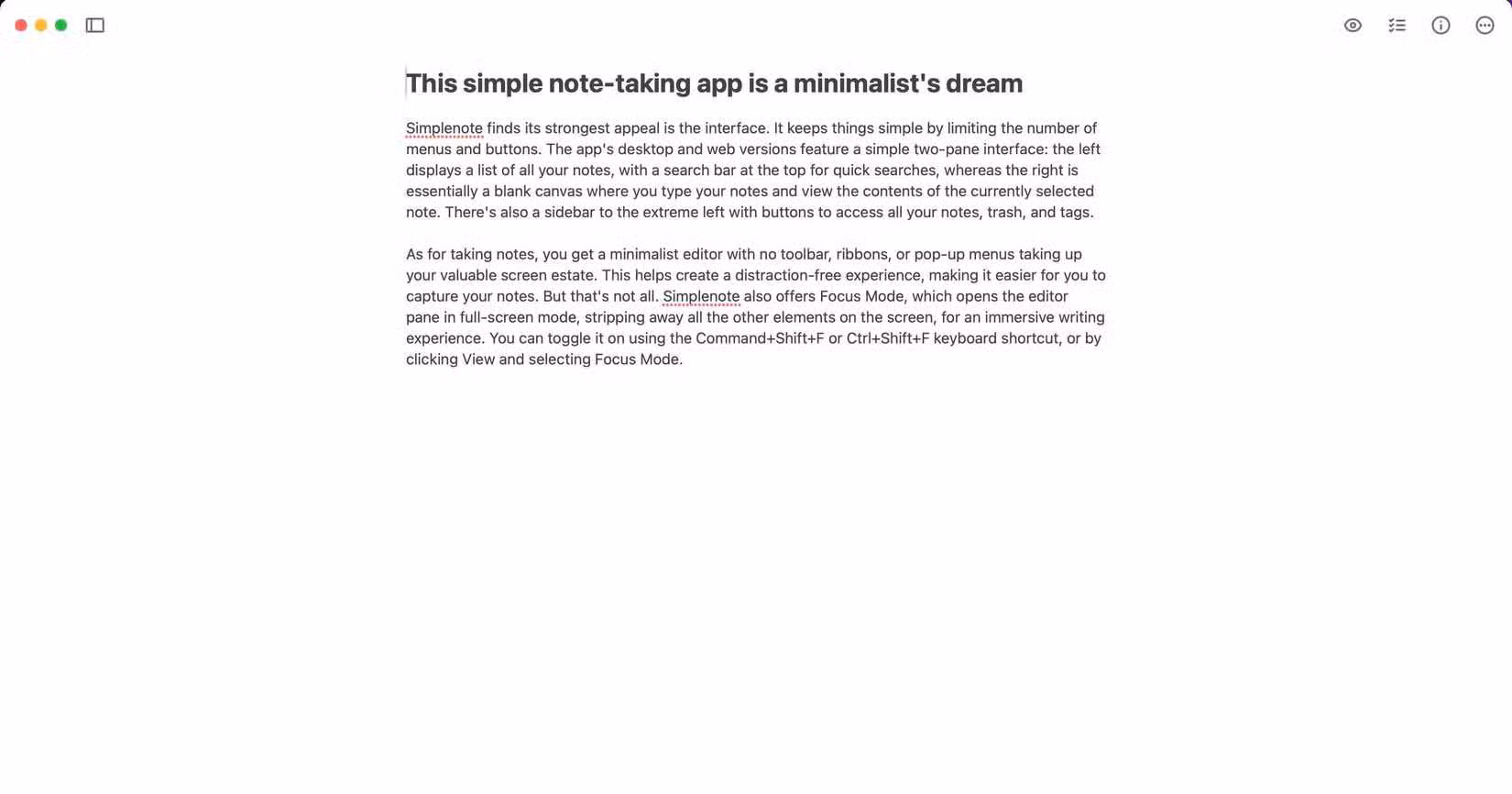 أما بالنسبة لتدوين الملاحظات، فستحصل على محرر بسيط بدون شريط أدوات أو أشرطة أو قوائم منبثقة تشغل مساحة الشاشة الثمينة. يساعد ذلك في إنشاء تجربة خالية من التشتيت، مما يسهل عليك التقاط ملاحظاتك. ولكن هذا ليس كل شيء. يوفر Simplenote أيضًا وضع التركيز، الذي يفتح جزء المحرر في وضع ملء الشاشة، ويزيل جميع العناصر الأخرى الموجودة على الشاشة، للحصول على تجربة كتابة غامرة. يمكنك تبديله باستخدام اختصار لوحة المفاتيح Command + Option + F أو Ctrl + Shift + F، أو عن طريق النقر فوق عرض وتحديد وضع التركيز.