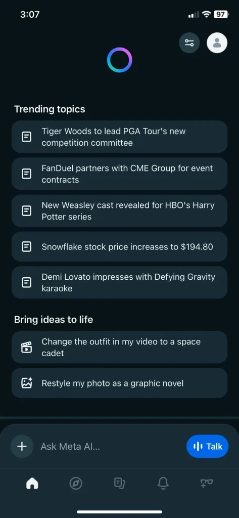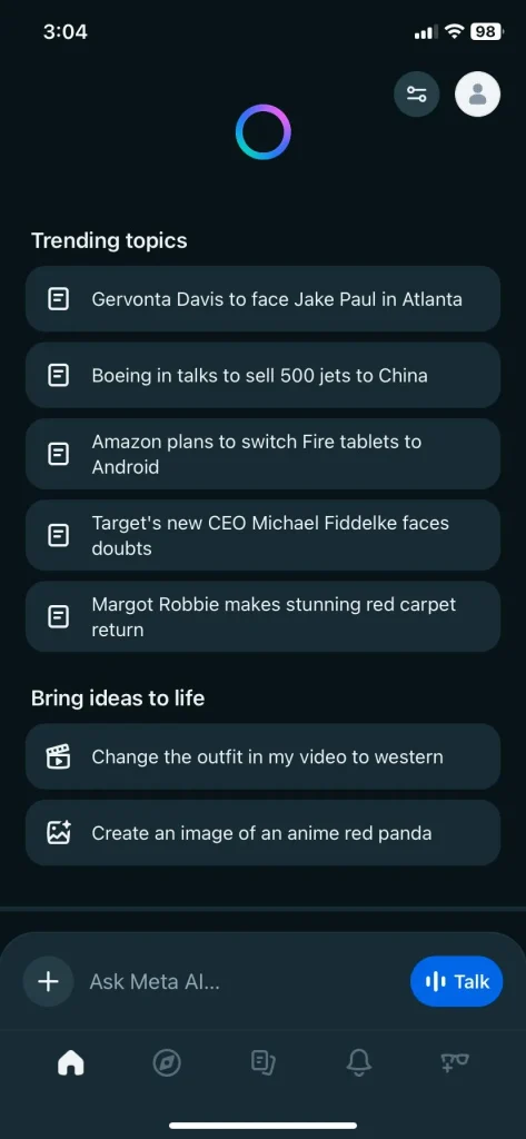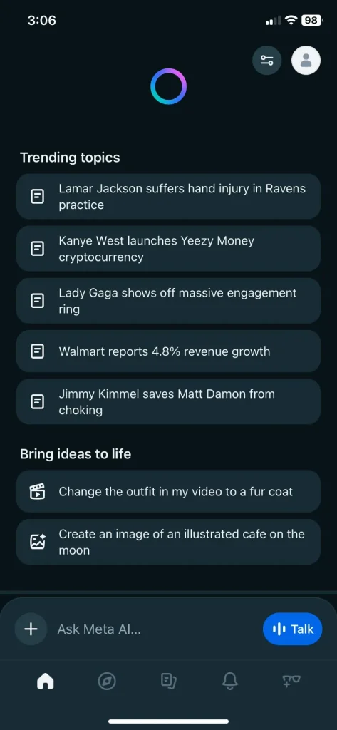 يقع قسم “المتداول” مباشرة أسفل شريط المطالبة، وهو أحد الأدوات التي لا تحظى بالتقدير الكافي في Meta AI. قد يبدو في البداية مجرد خلاصة للموضوعات الرائجة، ولكنه أكثر قيمة من ذلك بكثير. فهو يقدم لمحة موجزة ومنظمة وفي الوقت الفعلي عما يتحدث عنه الأشخاص عبر المنصة – من الأخبار العاجلة والأحداث الثقافية الهامة إلى اتجاهات الإنترنت الغريبة والتقنيات الناشئة. يعتبر قسم “المتداول” أداة أساسية لفهم نبض المجتمع الرقمي.
