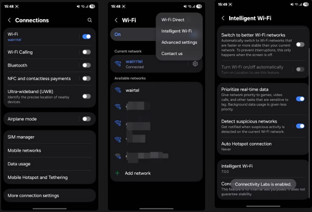 للوصول إليها، افتح Settings وانتقل إلى Connections > Wi-Fi. انقر على قائمة النقاط الثلاث في الزاوية العلوية اليمنى وحدد Intelligent Wi-Fi. قم بالتمرير إلى الأسفل وانقر على Intelligent Wi-Fi سبع مرات، ثم سترى النص Connectivity labs is enabled.