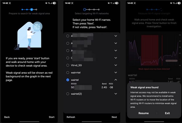 اعتقدت أن السبب قد يكون سوء وضع الموسع وأردت التأكد من ذلك. لذلك، قمت بسرعة بإجراء فحص باستخدام أداة Home Wi-Fi inspection. طلبت مني الأداة اختيار الشبكة والبدء في التجول في المنزل. أثناء تحركي، رسمت الأداة قوة وجودة الإشارة في مناطق مختلفة على رسم بياني. كانت هذه كل المعلومات التي أحتاجها للعثور على المواقع التي تتمتع بأقوى إشارات لجهاز الراوتر والموسع ووضعهما في المكان المناسب.
