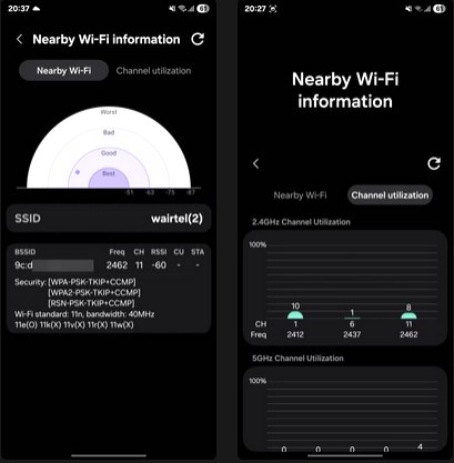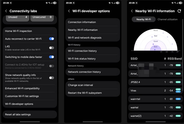 أداة معلومات Wi-Fi القريبة – المتوفرة كأحد خيارات المطورين ضمن مختبرات الاتصال – ساعدتني في تشخيص المشكلة وإصلاحها. تعرض هذه الأداة قائمة بجميع شبكات Wi-Fi القريبة منك، مع مجموعة من المعلومات المفيدة مثل مؤشر قوة الإشارة المستقبلة (RSSI) والنطاق الترددي. كما تصنفها بناءً على قوتها إلى الأفضل، و جيد، و سيئ، و الأسوأ.