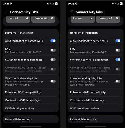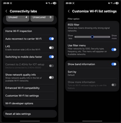 أخفت Samsung قائمة Connectivity labs ضمن إعدادات Wi-Fi، ربما للحفاظ على بقية القائمة خالية من الفوضى.