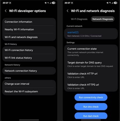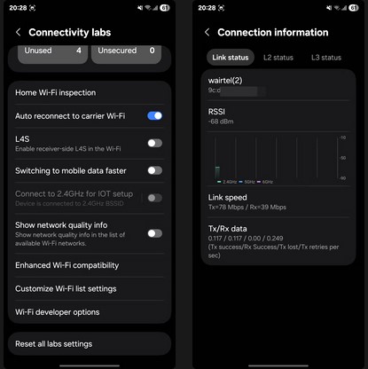 Connectivity labs هي أداة تشخيص Wi-Fi مدمجة في هواتف Galaxy. تتيح لك تحديد المشكلات المتعلقة بشبكة Wi-Fi الخاصة بك واستكشاف الأخطاء وإصلاحها مباشرة على هاتفك.