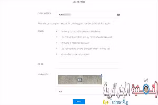 تنزل قليلا و في نفس الصفحة تقوم بالتعليم على سبب معين من الأسباب المقترحة أو تقف عند Other و تعبر عن السبب برأيك الخاص ، ثم بعد ذلك تدخل رمز التحقق و تنقر على Unlist.