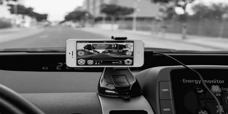 ستحتاج أيضًا إلى حامل للهاتف على السيارة حيث يمكنك الحصول عليه بسهولة من أي متجر للالكترونيات أو من خلال Amazon. تأكد من وضع الحامل بحيث يمكنه توجيه كاميرا هاتفك إلى اتجاه يسجل فيه الزاوية المطلوبة.