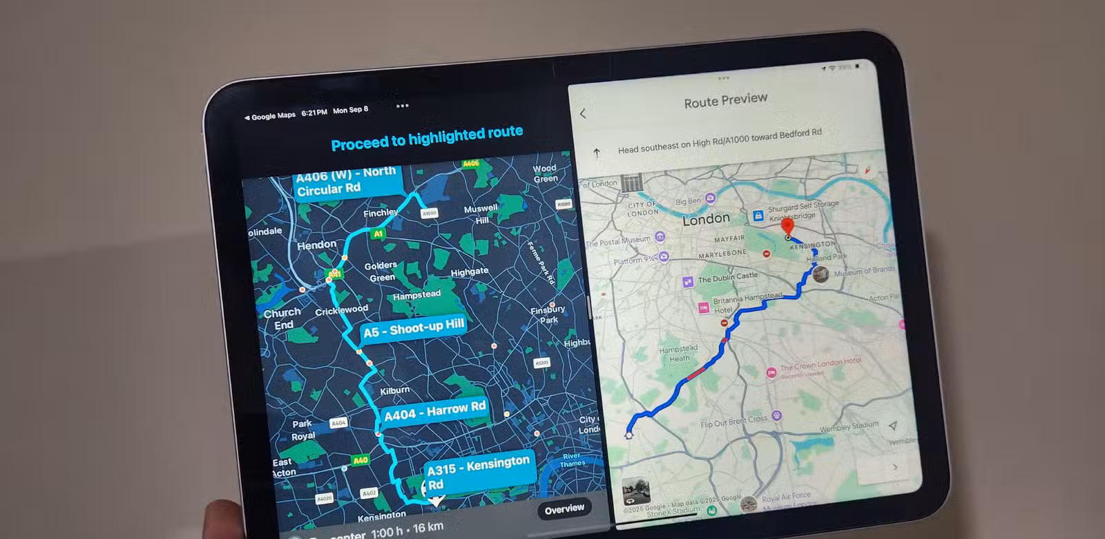 من ناحية أخرى، يبدو Google Maps نظيفًا واحترافيًا (بغض النظر عن أيقونات المركبات القبيحة الشبيهة بالكتل—أختار المؤشر في كل مرة). يتم تقديم الطرق بوضوح ويتم ترميز أنماط حركة المرور بالألوان لجعلها قابلة للتمييز على الفور في لمحة. المعلومات الأساسية غير متكررة ولا تتنافس مع بقية الواجهة، مما يترك تشتيتًا بصريًا أقل أثناء محاولتك للعثور على طريقك. كسائق دراجة نارية وسائق سيارة في بعض الأحيان، فإن عرض Google Maps بشكل بارز عبر Android Auto أو تثبيته على حامل Quad Lock يمنحني راحة بال أكبر.