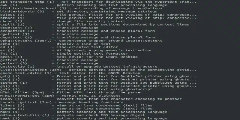 man هو العثور على أمر يفعل ما تحتاجه. إذا كنت تحتاج ، على سبيل المثال ، أمر لفرز نص في ملف ، يمكنك استخدام الوسيطة -k ، متبوعة بسلسلة من ما تبحث عنه. سيقوم هذا بالبحث في كل أوصاف الأوامر المطابقة. إذا كنت تريد البحث عن عبارة محددة ، قم بتضمين وسيطة البحث الخاصة بك بين علامتي اقتباس.