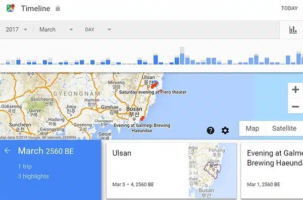 لديك بعض الخيارات لتصور سجل المواقع الخاص بك. الأول والأبسط ، هو أداة التسلسل الزمني الخاصة بـ Google، والتي يمكنك الوصول إليها ببساطة عن طريق تسجيل الدخول في Google Timeline ومشاهدة خريطة بها نقاط تعرض لك كل الأماكن لسجل Google مع إحداثياتك. إنه أمر رائع لأنه يتطلب بضع نقرات فقط ، يخبرك هذا عن الرحلات التي قمت بها ، ويمنحك بعض الأدوات لرؤية تحركاتك بمرور الوقت. وتفتقر تصوراته الأكثر تبسيطية إلى التأثير البصري السهل لخارطة الحرارة ، على الرغم من ذلك ؛ لا تغير النقاط حتى حجمها أو لونها بناءً على عدد المرات التي زرتها فيها.