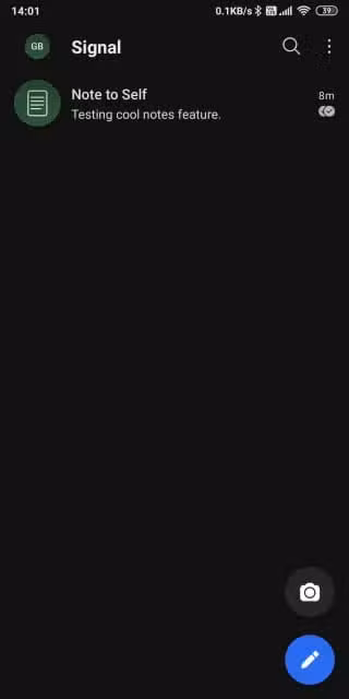 يحتوي Signal على واجهة لائقة مع سمات فاتحة ومُظلمة. يوجد زران في الأسفل لإنشاء وإرسال رسائل نصية ووسائط باستخدام الكاميرا. يكون خيار ملاحظة إلى الذات مرئيًا في الأعلى افتراضيًا. انقر على الأحرف الأولى من اسمك للوصول إلى الإعدادات والخيارات الأخرى. نهج قياسي جدًا تم تجربته واختباره. لا يحتاج التطبيق إلى منحنى التعلم هنا.