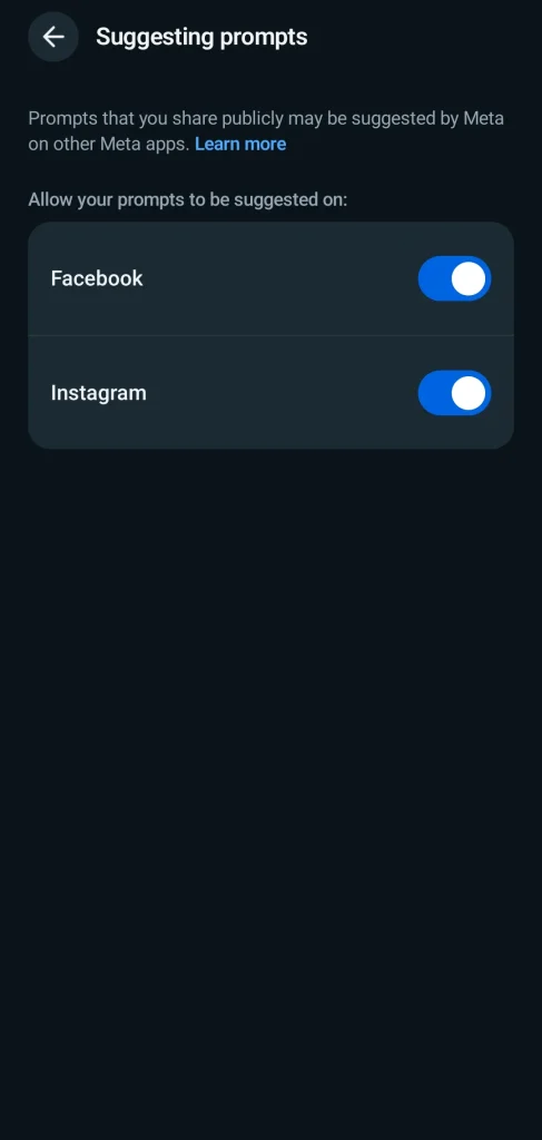 - أوقف تشغيل الأزرار الموجودة بجوار Facebook و Instagram. سيمنع هذا Meta AI من اقتراح مطالباتك على هذه المنصات.